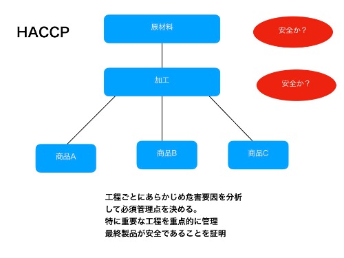 | 従来は、最終製品のサンプリング検査で安全なら安全と確認してますが。HACCPでは、工程ごとに安全を確認することで、最終製品のすべてが安全であると確認することができます。 | |